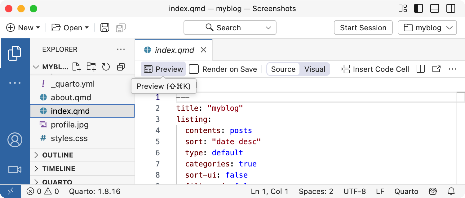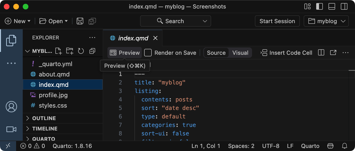 quarto create project blog myblogThis will create the scaffolding for a simple blog in the myblog sub-directory. Use the quarto preview command to render and preview the blog: